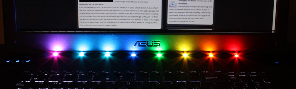 Each of the eight RGB LEDs can be addressed in this little fixture to create smooth blends of color or flash with near police-like hypnotism. PlasmaTrim's power isn't just from the brilliance of the LEDs, but also in it's simple design and addressability. The easy-to-use software allows the user to create awesome looks that can be uploaded to the unit, which can then be plugged into any USB port just to get some juice. For those who wish to dabble in the digits, the Open API will empower code monkeys to create useful plugins. Perhaps you want to use it to let you know when you have new email or when it's time to backup your files... PlasmaTrim and your code could make it happen!